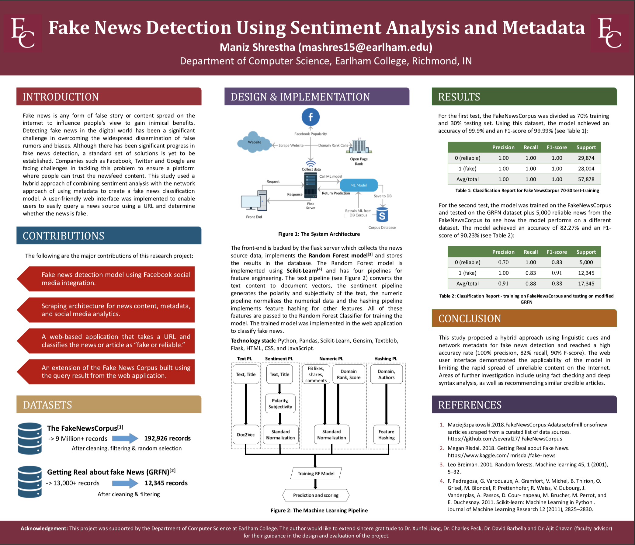 Worked on the demo presentation. Experimented with 2 datasets each taking 4 hours of run time. One observation I found is that changing the labels of the fake news changes the accuracy. It was found that detecting reliable news rather than fake news was statistically better in performance.
