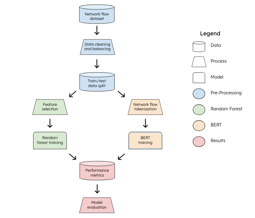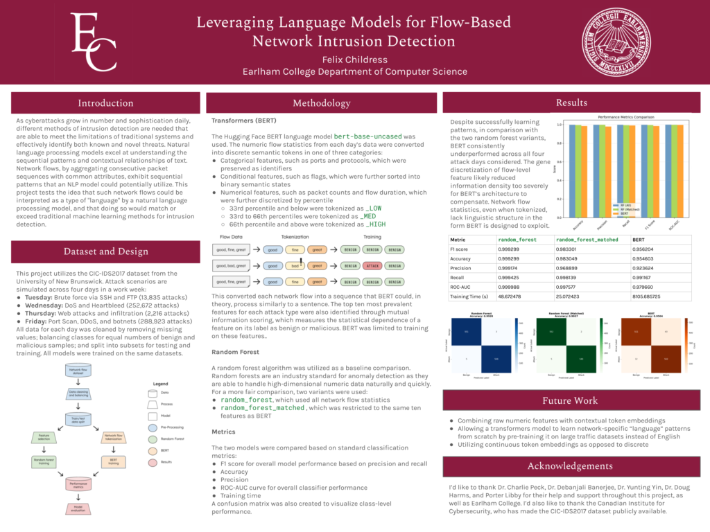 The overall goal of my project is to explore how, and if, transformer-based NLP models can match or exceed traditional ML approaches to network security. This primarily will be accomplished through treating tokenized flow-level features from the CIC-IDS 2017 dataset as language-like sequences.