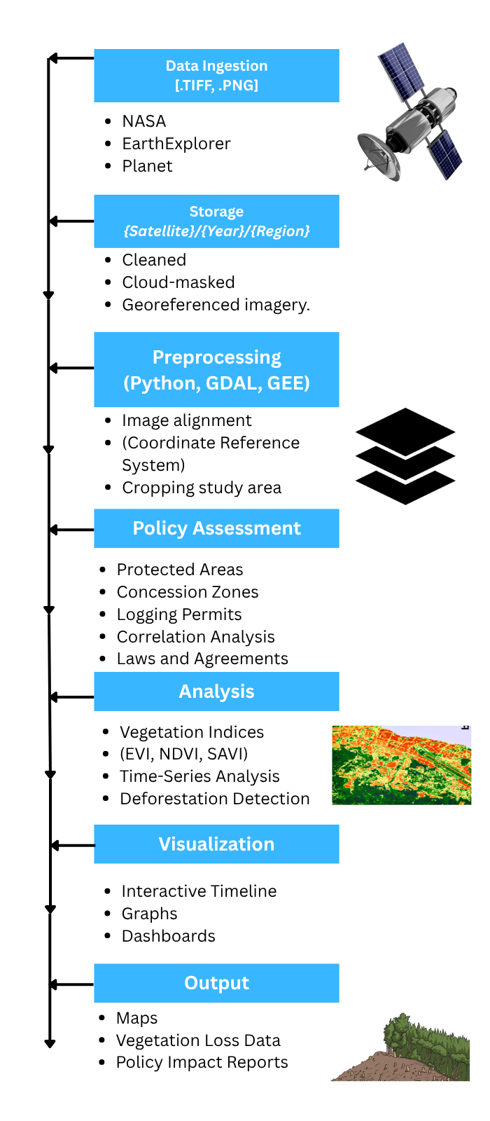 The project integrates multiple remote-sensing data sources, including Landsat-derived land cover maps from NASA EarthData, modeled deforestation scenarios extending to 2050, and independent forest-loss data from Global Forest Watch. I designed a reproducible geospatial pipeline using Python, QGIS, and raster analysis techniques to process GeoTIFF imagery, perform pixel-level land-cover classification, and convert satellite data into quantitative measures of forest loss and recovery. Custom scripts automate pixel counting, batch processing, visualization, and video generation, demonstrating how computer science methods can scale environmental monitoring across large spatial and temporal datasets.