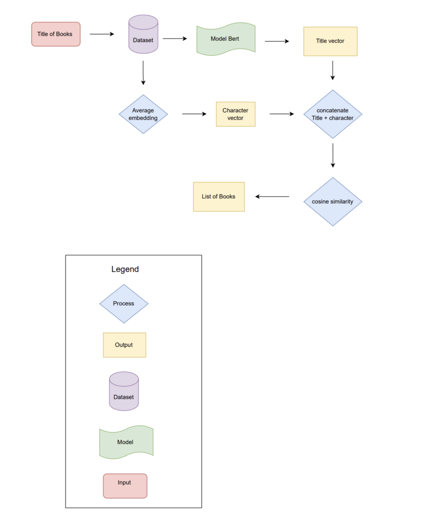 The goal of this project is to develop a recommendation engine that identifies books with characters similar to those the user already enjoys, regardless of genre. By The goal of this project is to create a recommendation engine that finds books with characters similar to those the user already enjoys, regardless of genre. By combining BERT-generated title embeddings with precomputed character embeddings, the system creates a hybrid semantic representation for each book. Using cosine similarity, it then suggests new books with characters who have comparable traits, helping users explore new stories.combining BERT generated title embeddings with precomputed character embeddings, the system forms a hybrid semantic representation of each book. Using cosine similarity, it then recommends new books that feature characters with comparable traits, helping users branch out into new stories